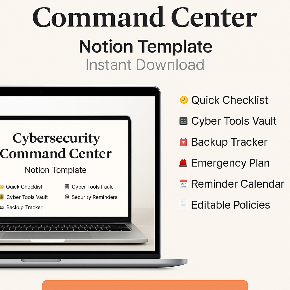 The Cybersecurity Command Center is a plug-and-play Notion template that helps solopreneurs, creators, and small business owners organize and improve their digital security — even if you're not tech-savvy.